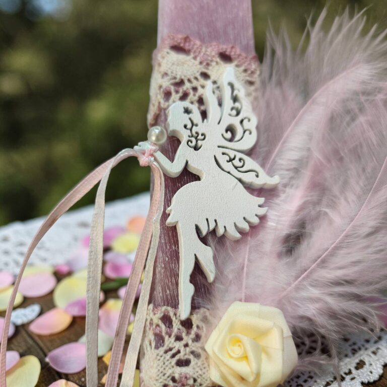 Ο συνδυασμός της νεράιδας με τα απαλά πον πον χαρίζει μια γλυκιά και κομψή εμφάνιση, κάνοντας τη λαμπάδα ξεχωριστή για τη βραδιά της Ανάστασης.